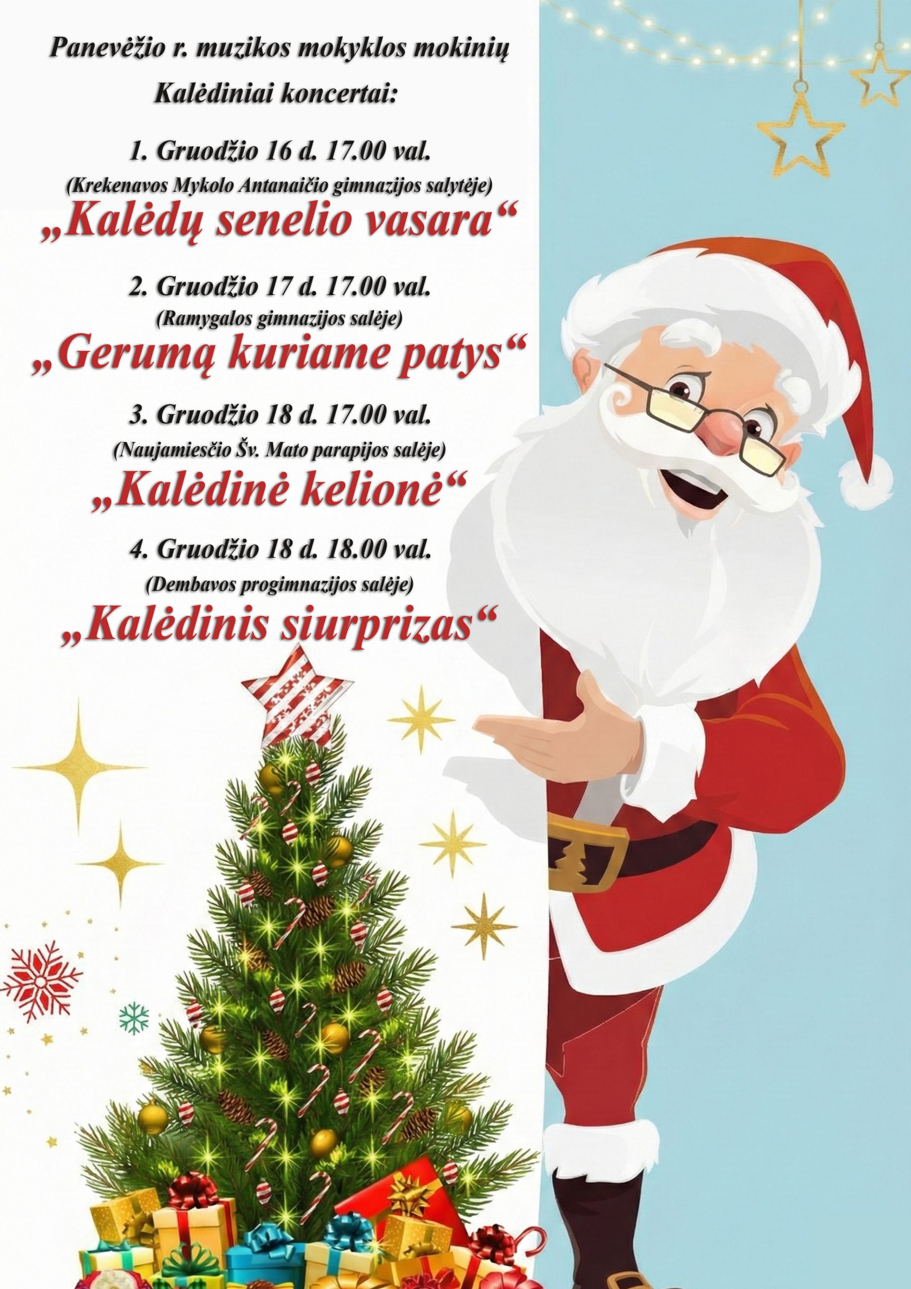 Gruodžio 1 d. Krekenavos merginų vokalinis ansamblis (mokytoja Jecinta Garbaliauskienė) ir akordeonistų ansamblis (NVŠ „Linksmasis akordeonas“, mokytoja Diana Venckienė) koncertavo Panevėžio Šv. Juozapo globos namuose.