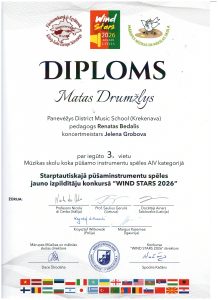 Kovo 4 d. Latvijoje, Mārupės muzikos ir meno mokykloje, vyko VII tarptautinis jaunųjų atlikėjų pučiamaisiais ir mušamaisiais instrumentais konkursas „WIND STARS 2026“. Jame sėkmingai pasirodė klarneto specialybės mokinys Matas Drumžlys, pelnęs III vietos diplomą. Mokinį konkursui parengė mokytojas Renatas Bedalis, koncertmeisterė – Jelena Grobova. Konkursas subūrė jaunuosius atlikėjus iš įvairių šalių, suteikdamas galimybę jauniesiems muzikantams pristatyti savo meninius gebėjimus, įgyti sceninės patirties ir pasidalinti muzikinėmis idėjomis.